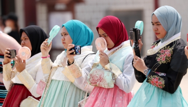 韩国高温天气持续,首尔最高气温逼近40度,这样的天气考验着外国游客。在首尔各大名胜古迹,依然可以看到外国游客身着韩服,手拿电风扇拍照的景象。虽然这种用涤纶等透气性较差的面料制作的韩服给游客带来诸多不适,但依然备受追捧。