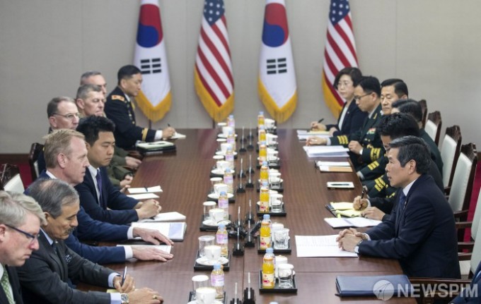 | 韩国国防部长官郑景斗(右)和美国国防部代理部长沙纳汉在会谈上发言。【图片=NEWSPIM】 |