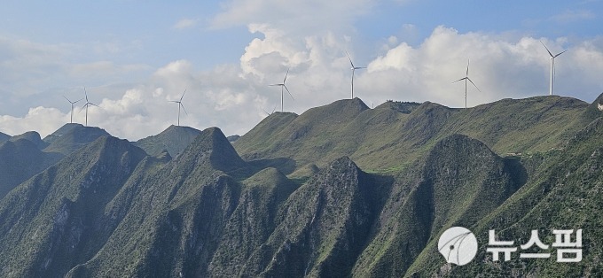 从贵州省安顺市附近的花江峡谷大桥桥面望去,峡谷上方的高山地区到处都设有太阳能发电设施和风力发电站。【图片=记者 崔宪圭 摄】 |