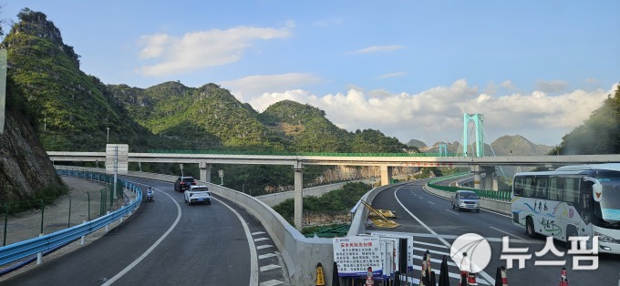 海拔1000米的高地上,连接山峰与峡谷的道路和桥梁像是悬浮在空中的单轨列车一样,四通八达地铺展开来。【图片=记者 崔宪圭 摄】 |