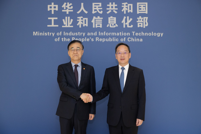 16日,在中国北京,韩国国土部长官金润德(左)与中国工业和信息化部部长李乐成举行会谈。【图片=国土部提供】 |