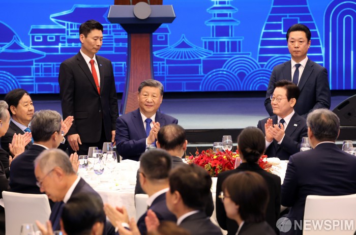 | 图为1日晚,韩国总统李在明(右)宴请韩国进行国事访问的中国国家主席习近平。【图片=APEC、韩联社】 |