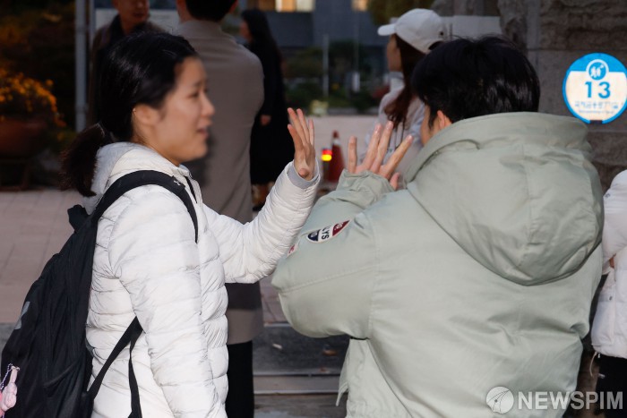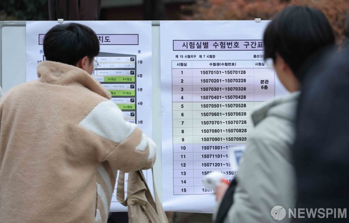 图为首尔市龙山区龙山高中,考生确认考场。【图片=纽斯频通讯社】