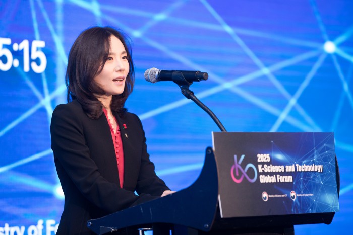 | 图为9日,韩国外交部第二次官金珍我出席在首尔举行的"2025 K-Science & Technology国际论坛"并致辞。【图片=科学技术信息通信部提供】 |